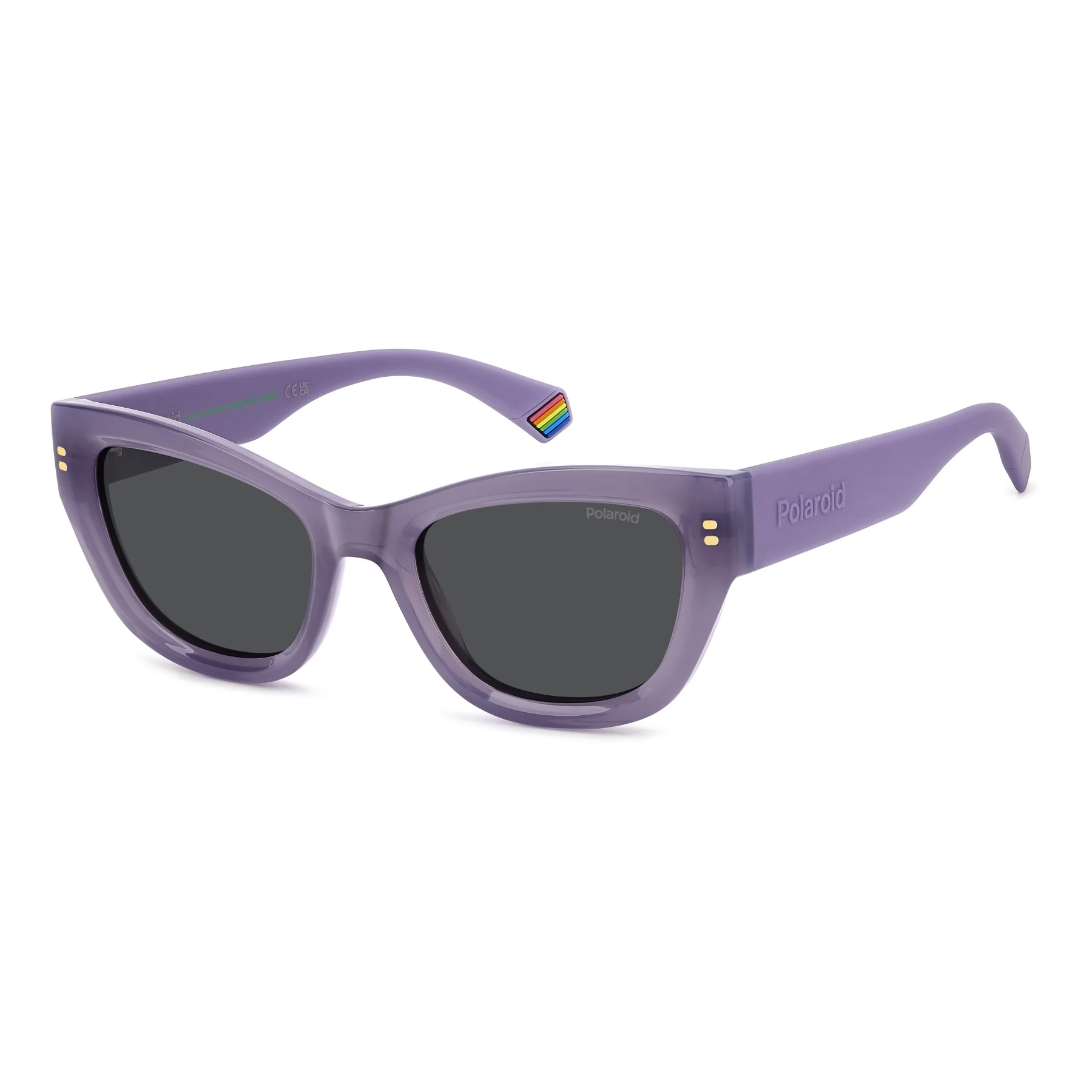 Trendsetters will love these women’s sunglasses from Polaroid, a fresh interpretation of the cat-eye shape. The bold front is multifaceted thanks to bevelling around the lenses, with a sculptural yet structured design. What’s more, the frames can be fitted with prescription sun lenses. The printed rivets are an added accent. The temples are equally striking: they’re maxi in their proportions, covered in rubber for a soft touch, and trimmed by a raised Polaroid logo.